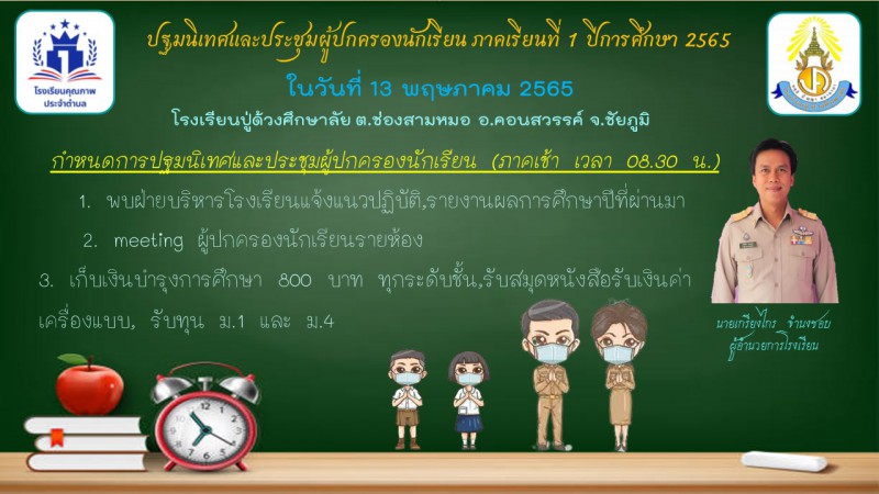 กิจกรรมปฐมนิเทศและประชุมผู้ปกครองนักเรียน ภาคเรียนที่ 1 ปีการศึกษา 2565